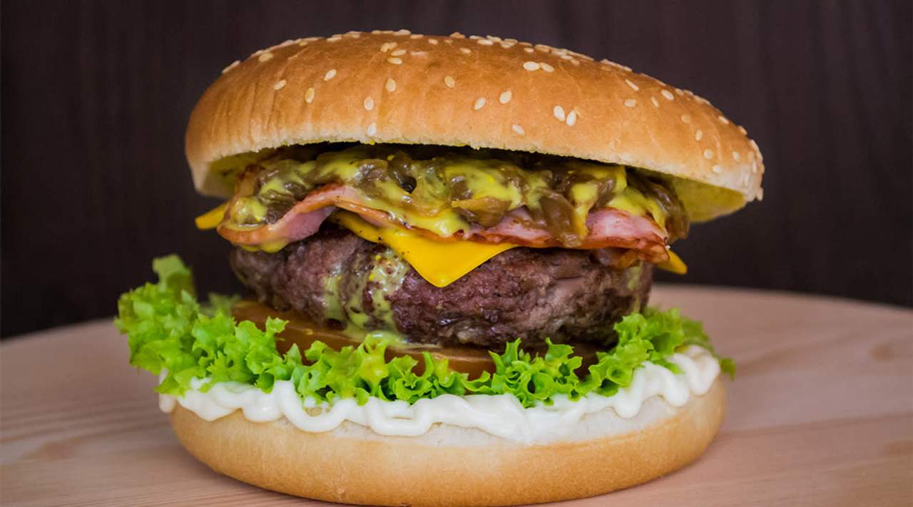 Locura de beicon: vaca madurada 21 días, cheddar fundido, bacon crujiente, mermelada de beicon y un toque de cebolla crujiente que explota en cada bocado.
