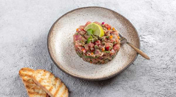 Con corazón de cubos de atún, aderezo de mantequilla picante y avellana