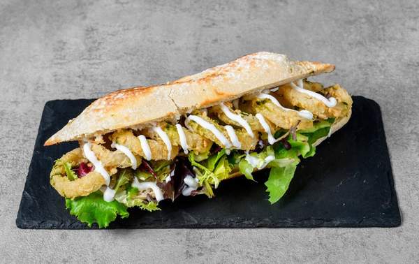 pollo empanado, lechuga, tomate, queso y mayonesa trufada