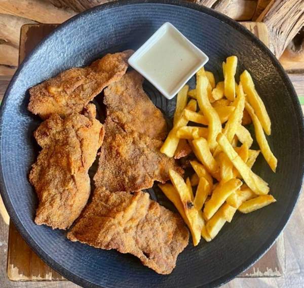 Filete de ternera, relleno de jamón Duroc y queso de fundir, con patatas de guarnición