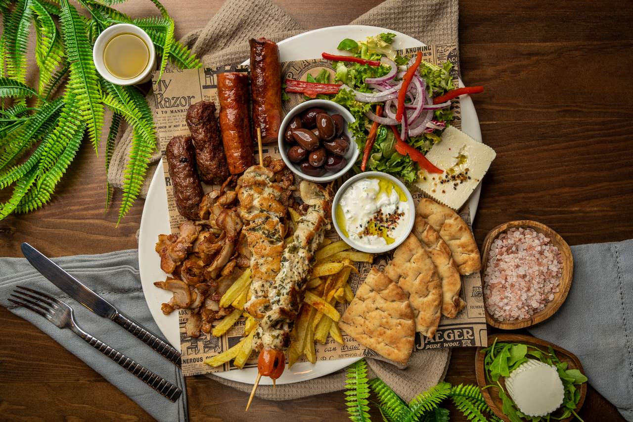 Mezcla griega, patatas fritas, pan pita, salsa tzatziki, queso feta, carne de pollo, 2 brochetas de pollo, 2 rollos de carne picada de vaca y cerdo y 2 salchichas de cerdo