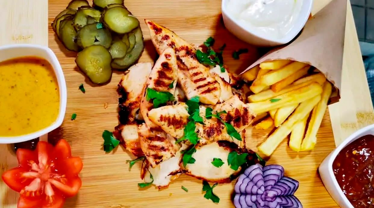 1/4 pollo asado, patatas fritas naturales, ensalada con salsa especial y 2 salsas picantes