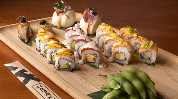 Roll relleno de plátano furai, aguacate y queso crema. Coronado con tartar de langostino, parmesano flameado y crema de rocoto.
