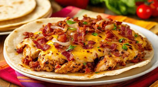 Tortillas de maíz rellenas de pollo o vegetales bañadas en salsa y gratinadas con queso, coronadas con nata agria, cilantro y cebolla. Guarnición de arroz