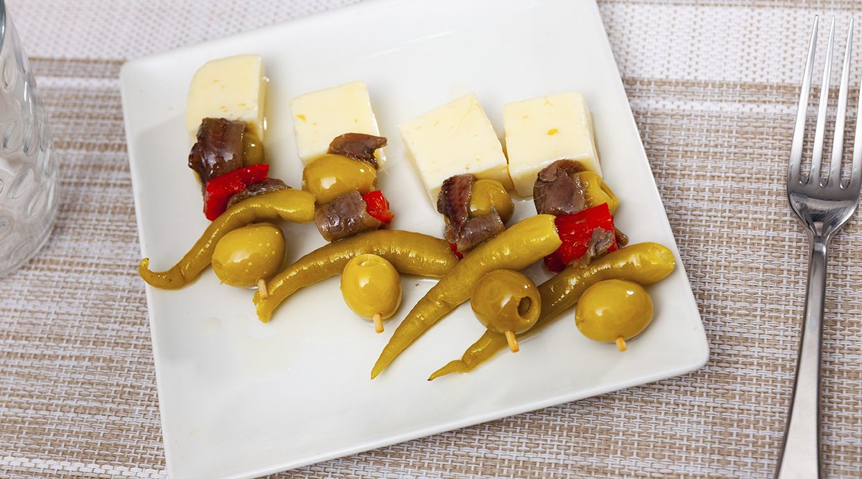 Gilda de anchoa del Cantábrico, piparra dulce, queso Emmental y tomates secos.
