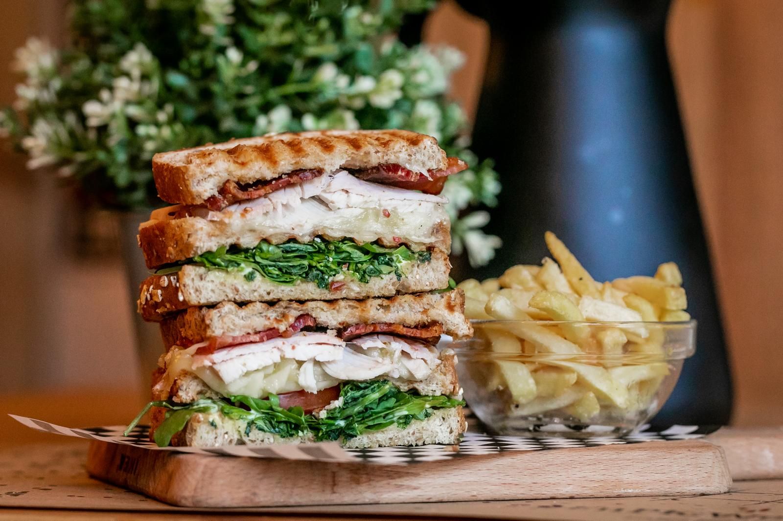 El clásico Club Sándwich. Bocadillo en 2 partes: La caliente - Pollo, pavo, bacon y queso gruyère fundido; y la fría - Tomate, espinacas y una deliciosa salsa