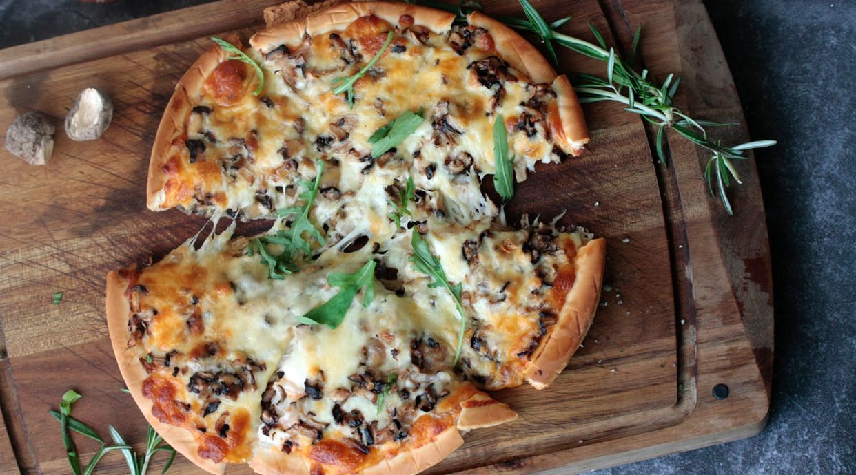 Tomate, queso Picsa, trompetas de la muerte y gorgonzola e hierbas frescas vegetariana