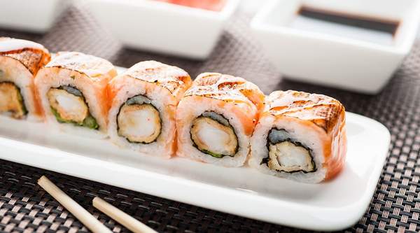 Roll de aguacate y salmón con salsa ponzu y sésamo