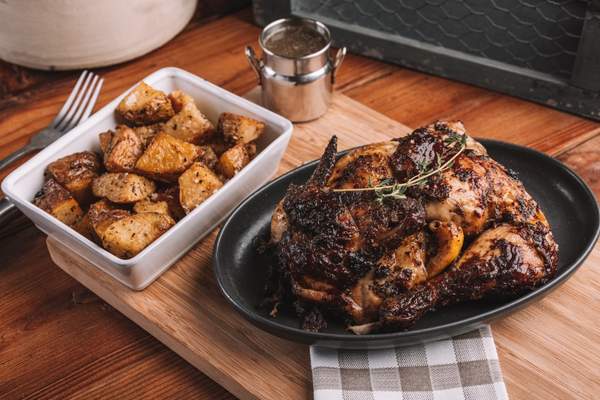 Asado al carbón, marinado 24h en nuestra receta secreta acompañado de su caldo y patatas rústicas o ensalada verde a elegir (para 1-2 personas).