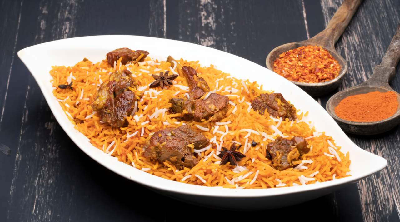 Red chilly especial, arroz basmati con gamba, ajo, cebolla, fruto seco y hierbas aromáticas