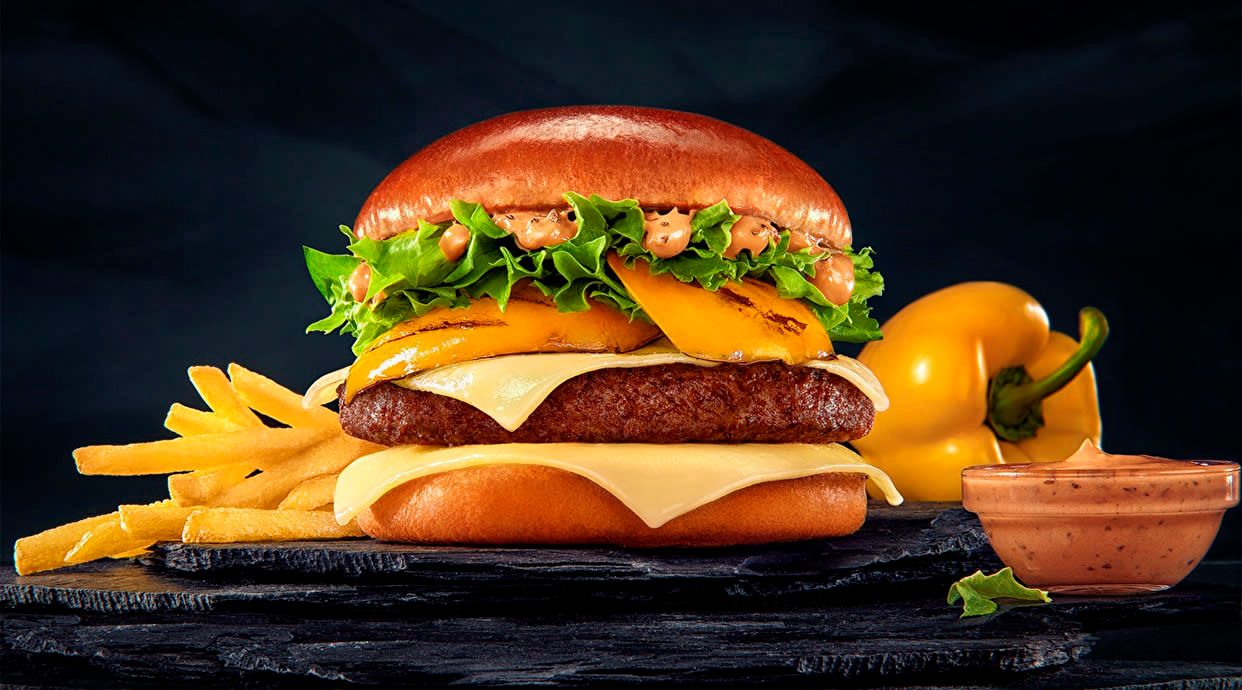 D'hamburguesa negre, pebrot verd escalivat, ou ferrat i allioli suau (servida amb pa negre), acompanyades de patates fregides naturals
