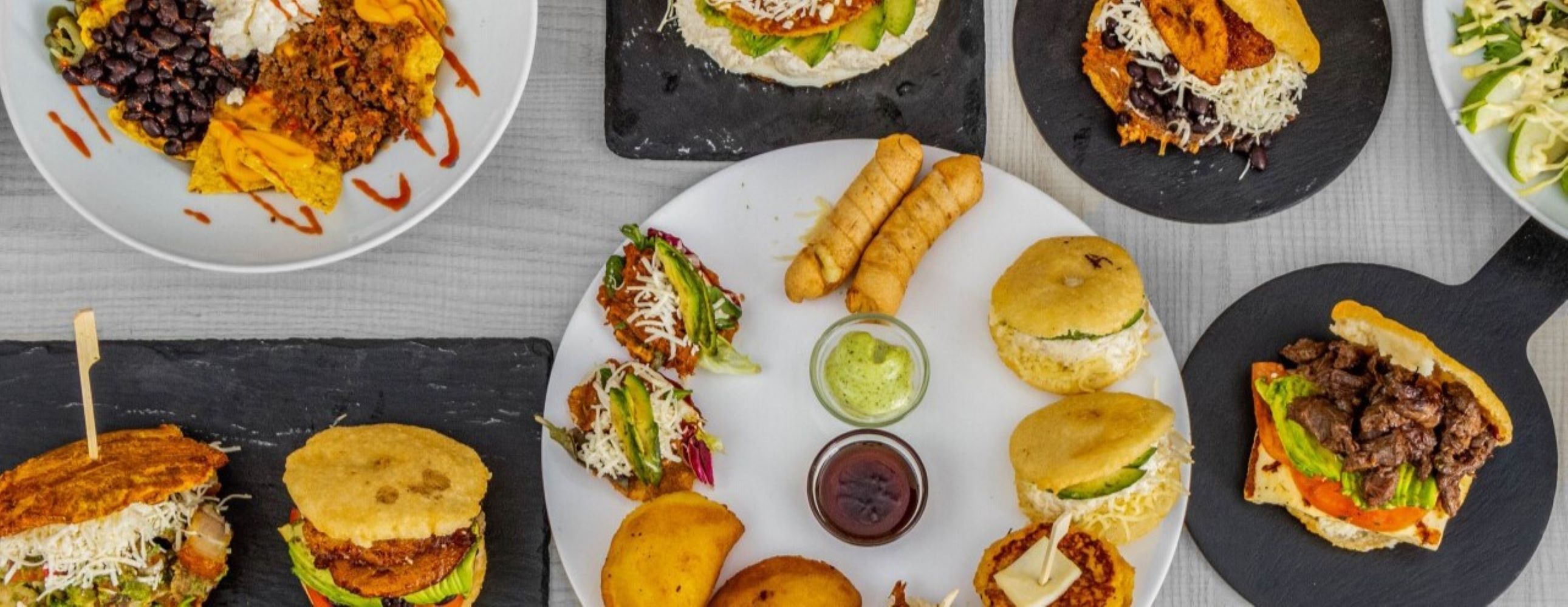 Tequeños (2 uds.), mini empanadas de pollo (2 uds.), mini arepas reina pepeada (2 uds.), mini cachapas con ternera deshilachada y queso (2 uds.) y mini patacón con ternera deshilachada (2 uds.) acompañado de salsa de ajo y papelon
