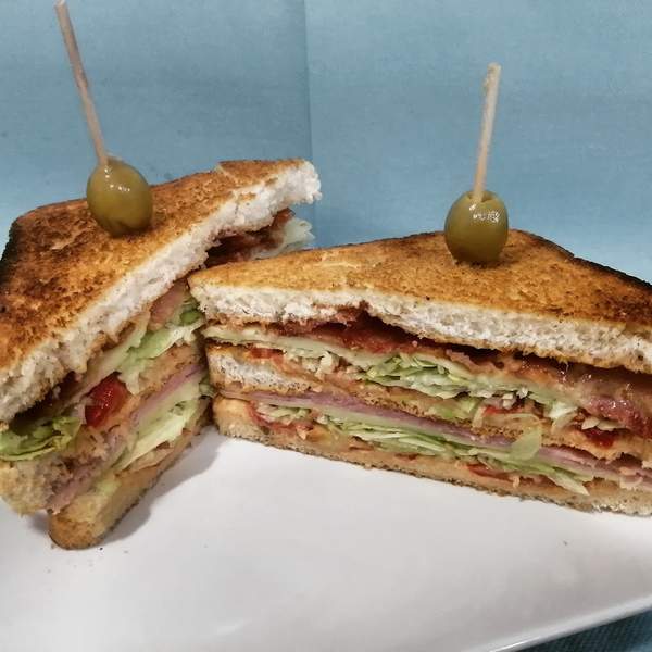 Bikini doble, lechuga, tomate, jamón dulce, queso, bacon, cebolla frita y salsa JC