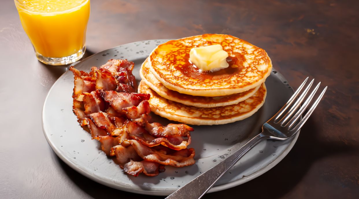 Cuatro tortitas americanas acompañadas de bacon , huevo revuelto y sirope de arce.