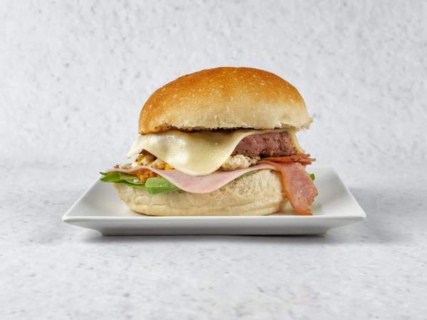 Hamburguesa con carne gallega 100% artesanal, pan artesano, queso, bacon, jamón york, huevo campero, lechuga, tomate, cebolla frita. Además, incluye un Gordo de La Primitiva de regalo. Como complemento perfecto, añade unas deliciosas patatas ali oli.