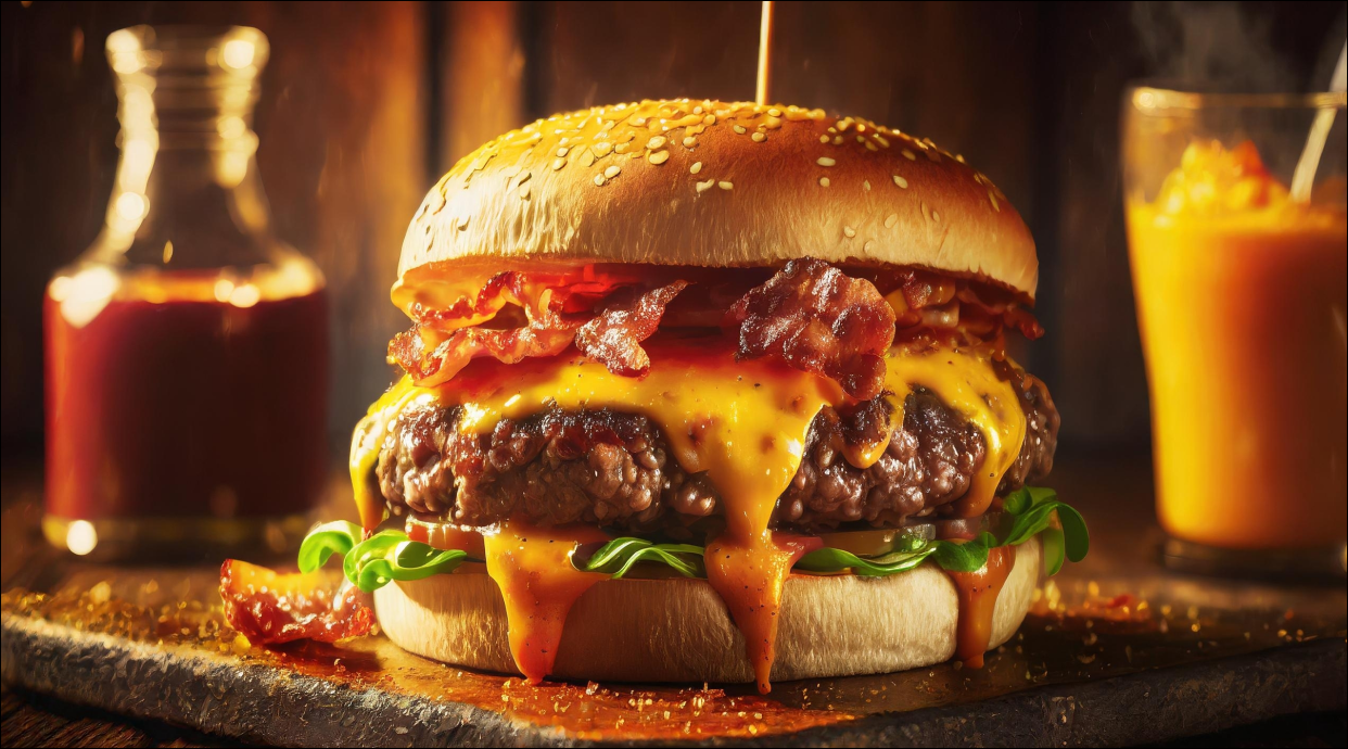 De ternera (200 g.) con queso cheddar, bacon ahumado, cebolla caramelizada, hojas verdes y tomate
