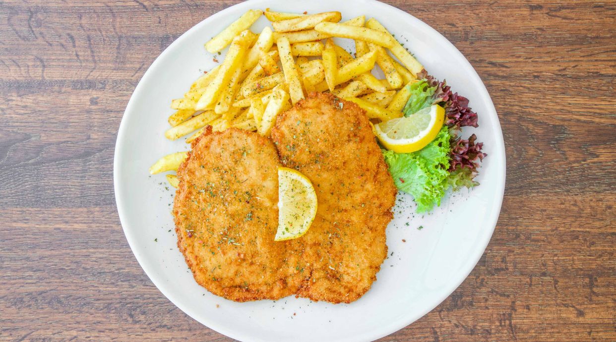 Escalope de cerdo jugoso y crujiente, acompañado de ensaladilla rusa fresca y cremosa.