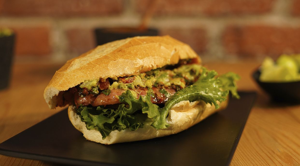 Chorizo criollo argentino, cocinado lentamente a la parrilla y cortado a mariposa, sobre crujiente pan. Con una salsa a elección.
