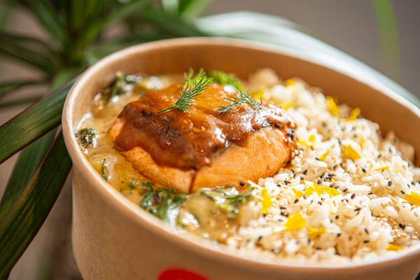Con curry amarillo, verduritas y arroz basmati aromatizado. Sin gluten la opción salmón. No garantizamos la contaminación cruzada. (pescado, frutos secos, cacahuete)