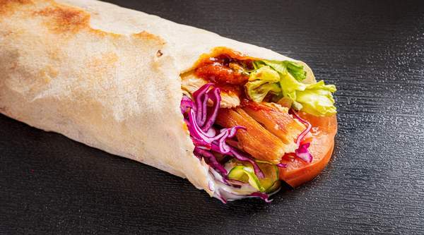 Tortilla, lechuga mixta, col lombarda, pepino, tomate, salsa de ajo, queso feta, salsa Iskander
