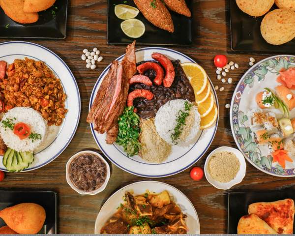 Plato típico brasileño a base de frijoles negros cocidos con carne de cerdo y embutidos, acompañado de arroz blanco, col salteada, farofa (harina de yuca tostada) y rodajas de chorizo ahumado.