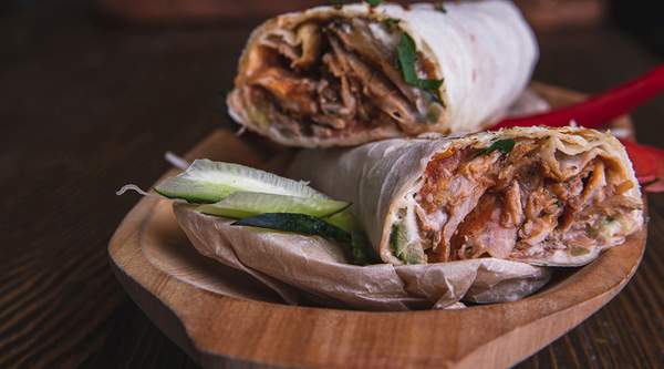 Durum con pinchos de pollo, lechuga, tomate y salsa blanca con patatas