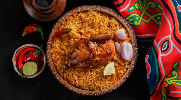 Arroz con pollo, cordero y especias con salsa de yogur o salsa de curry