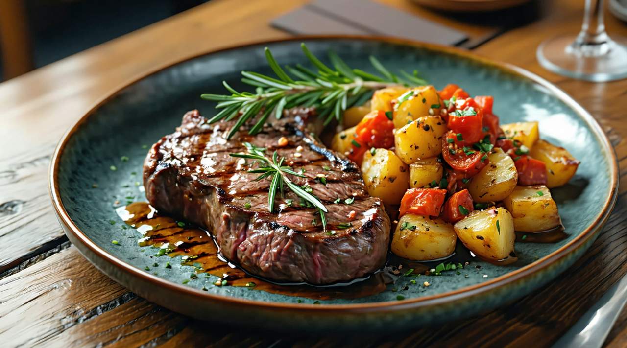 Corte tierno de entrecot a la plancha, acompañado de guarnición variada