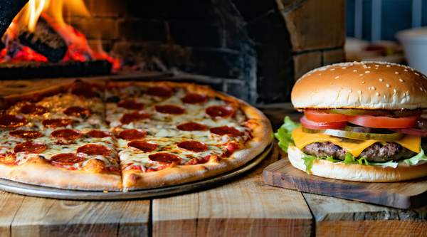 Tomate, mozzarella, carne, pimientos, cebolla y bacon