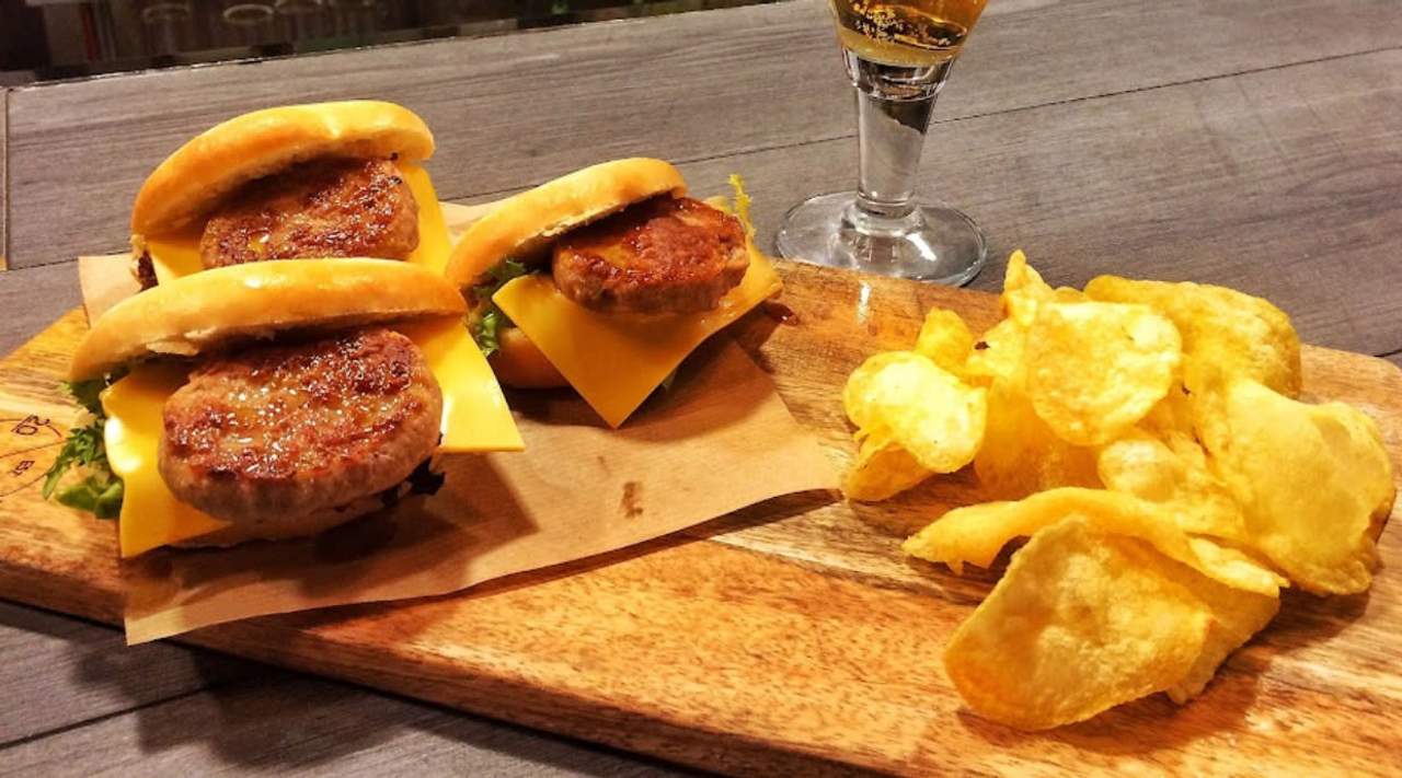 Pan cristalino redondo, rabas de calamar, cebolla confitada y mahonesa de lima.