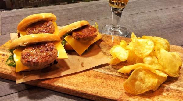 Con queso, cebolla confitada, lechuga y salsa deluxe, hechos con pan con tomate