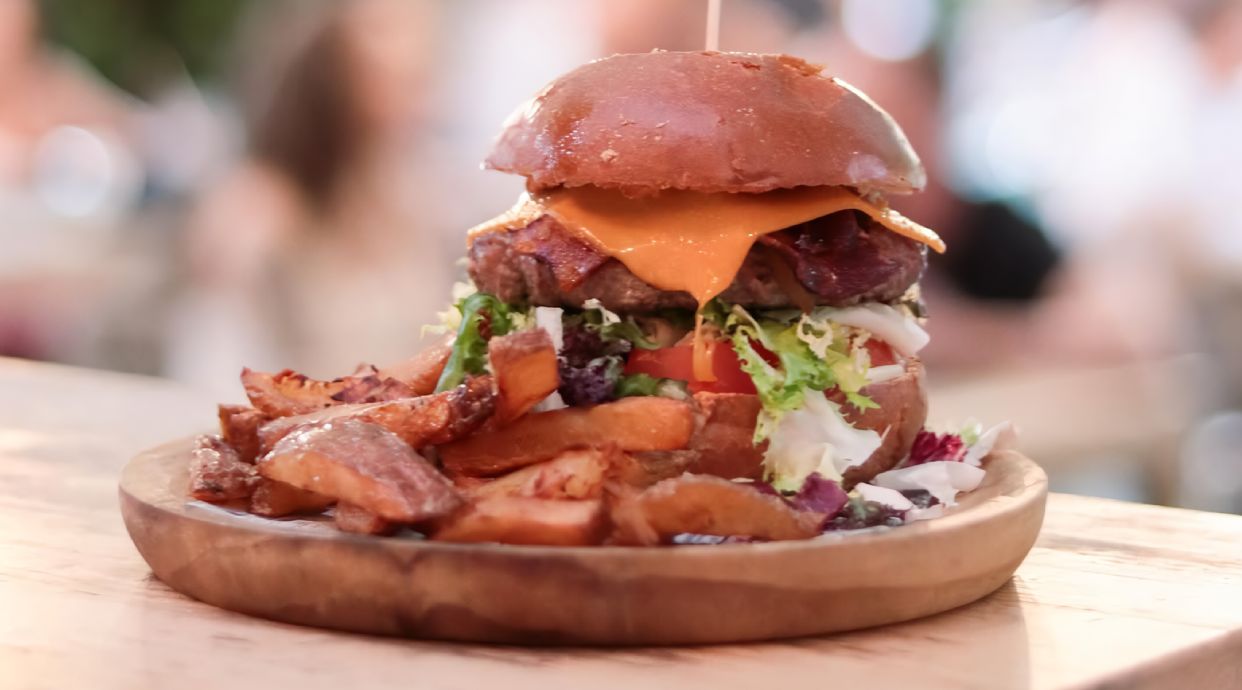 hamburguesa 100% ternera, con chutney de mango, queso cheddar, tomate, lechuga, bacon y foie. Acompañada de patata frita casera