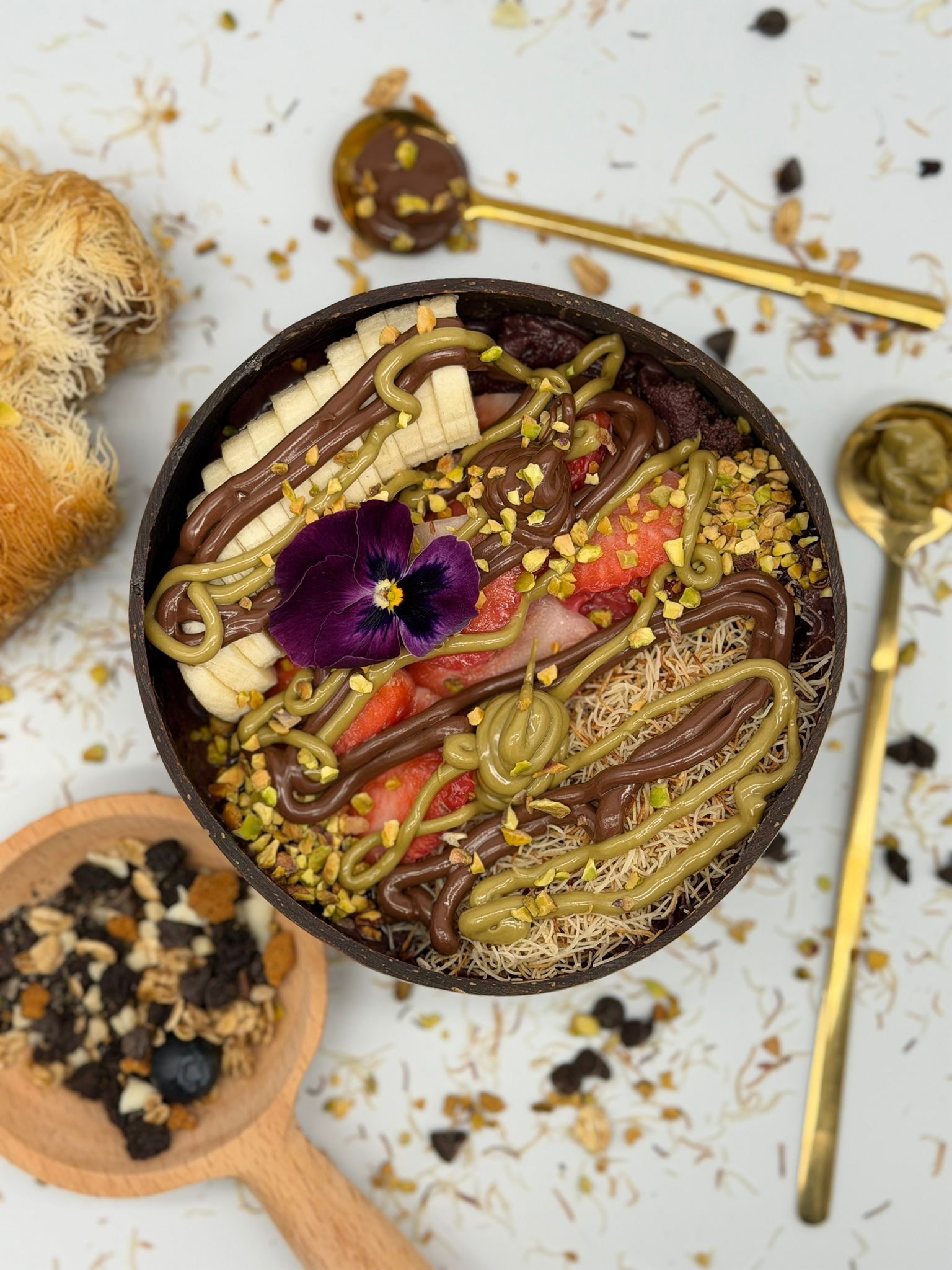 Açai, fresas, chispas de chocolate, nutella, kataifi crujiente, crema de pistacho y banana