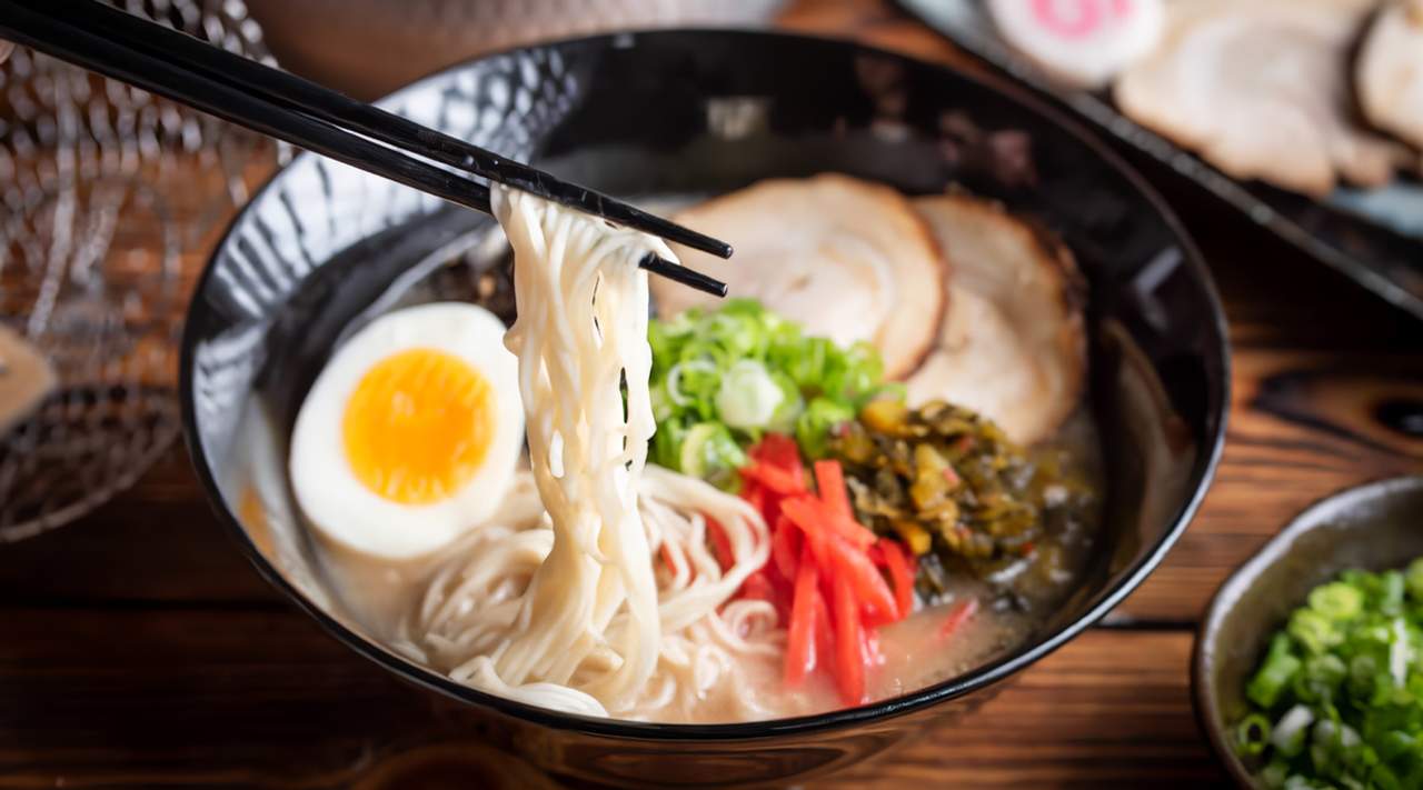 Ramen con caldo de cerdo, chashu de cerdo, vegetales, huevo y bambú marinados