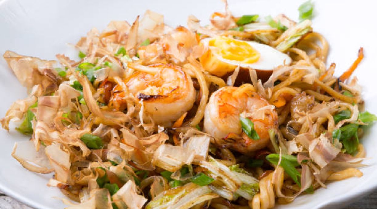 Udon Frito con gambas, verdura, zanahorias, cebolla y huevo.