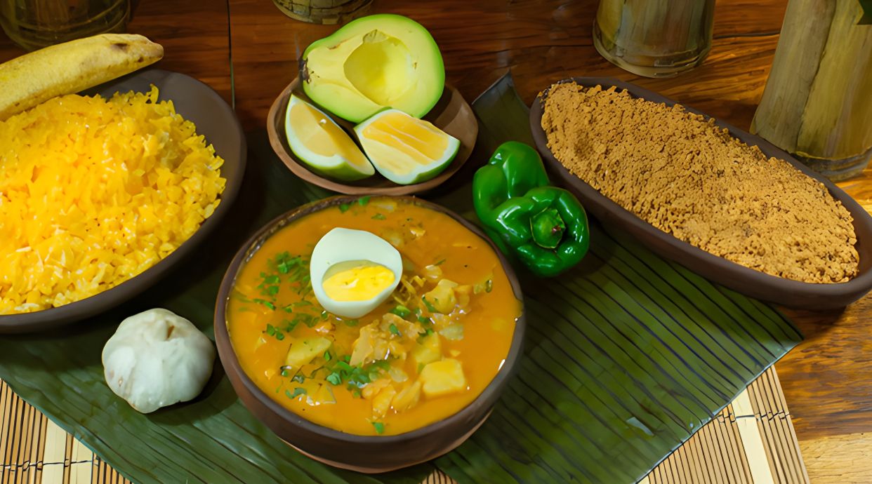 Caldo de pescado que contiene atún, yuca, cebolla colorada, cilantro, ají en polvo y otras especias más