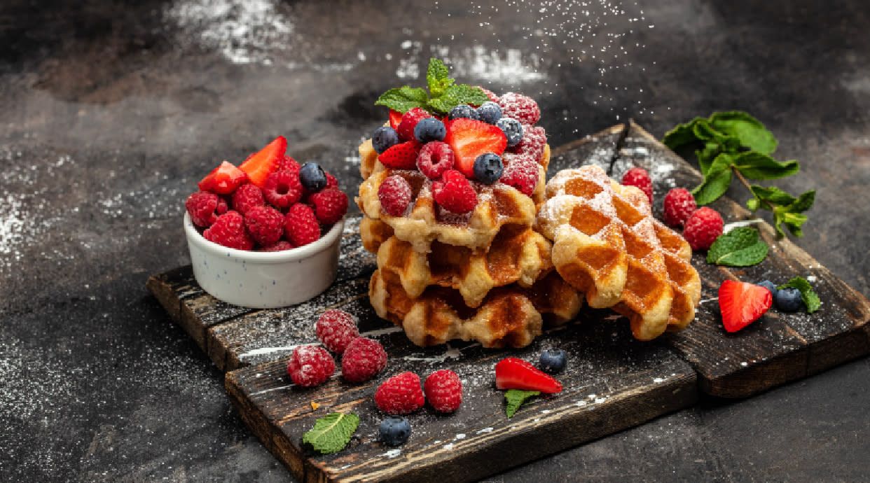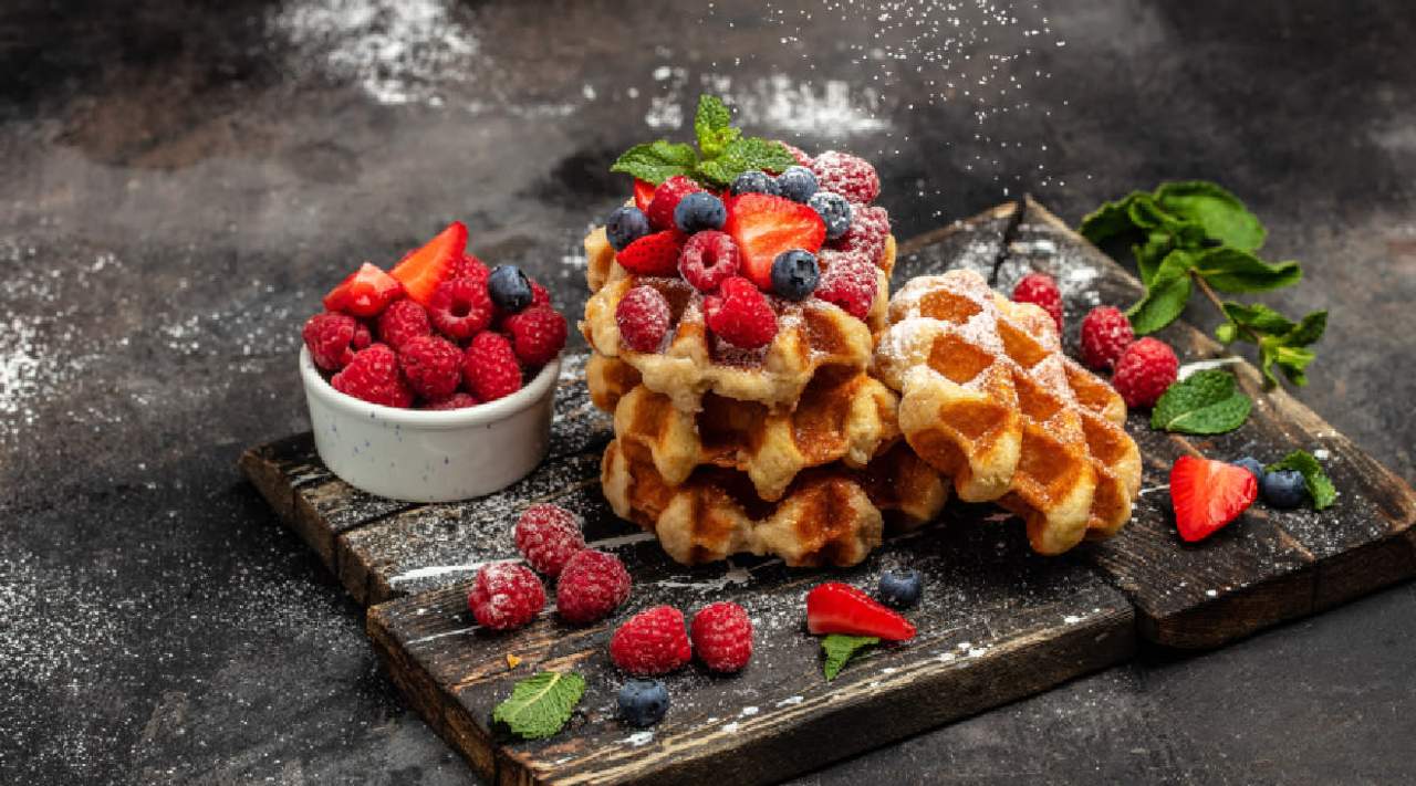 Gofre con sirope de Kinder Bueno, sirope de chocolate blanco y Kinder Bueno