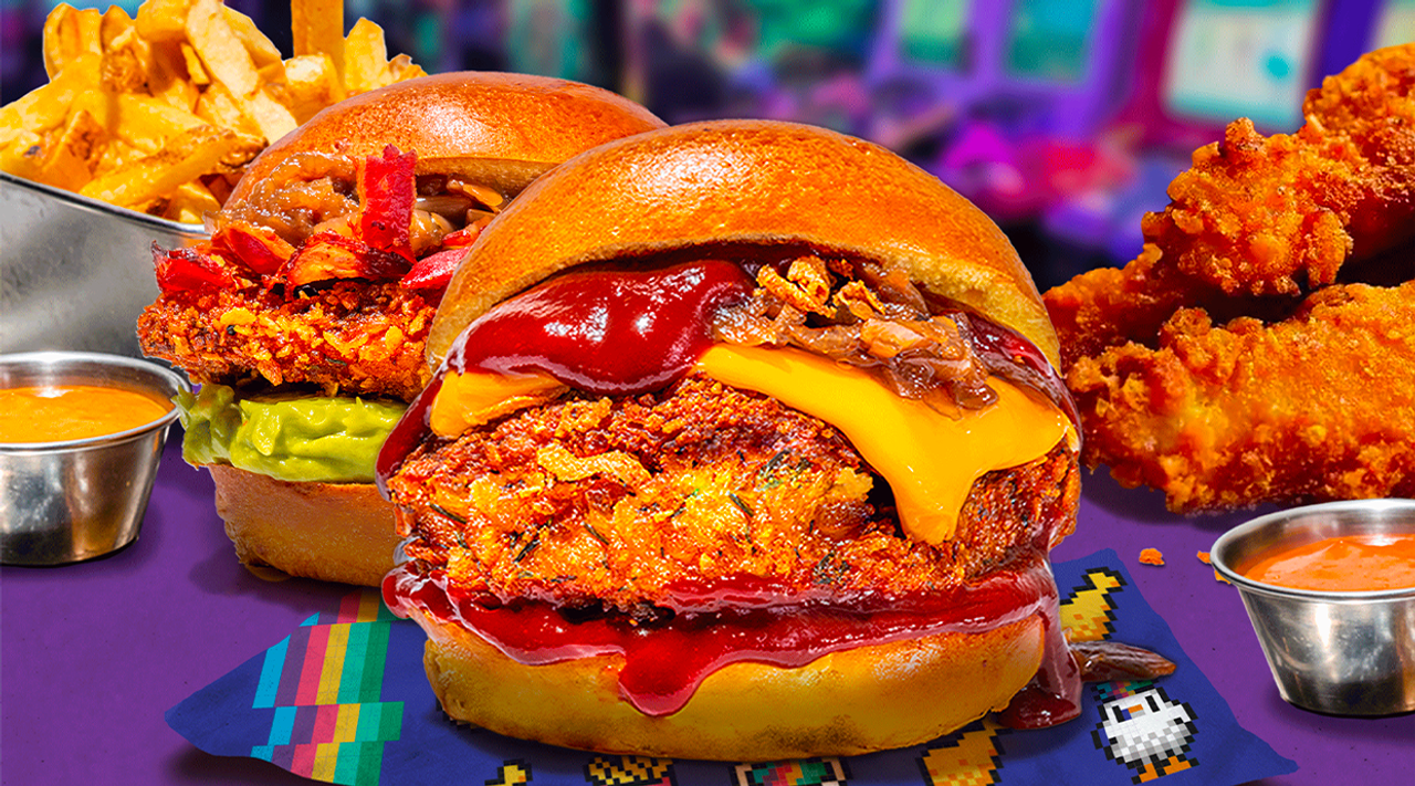 Pan brioche, pollo crispy, salsa creamy BBQ, queso cheddar, lechuga iceberg y cebolla caramelizada
