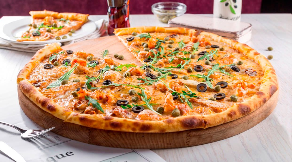 Tomàquet, llonganissa, pernil, xampinyons, mozzarella, bacó, gambes, olives negres.