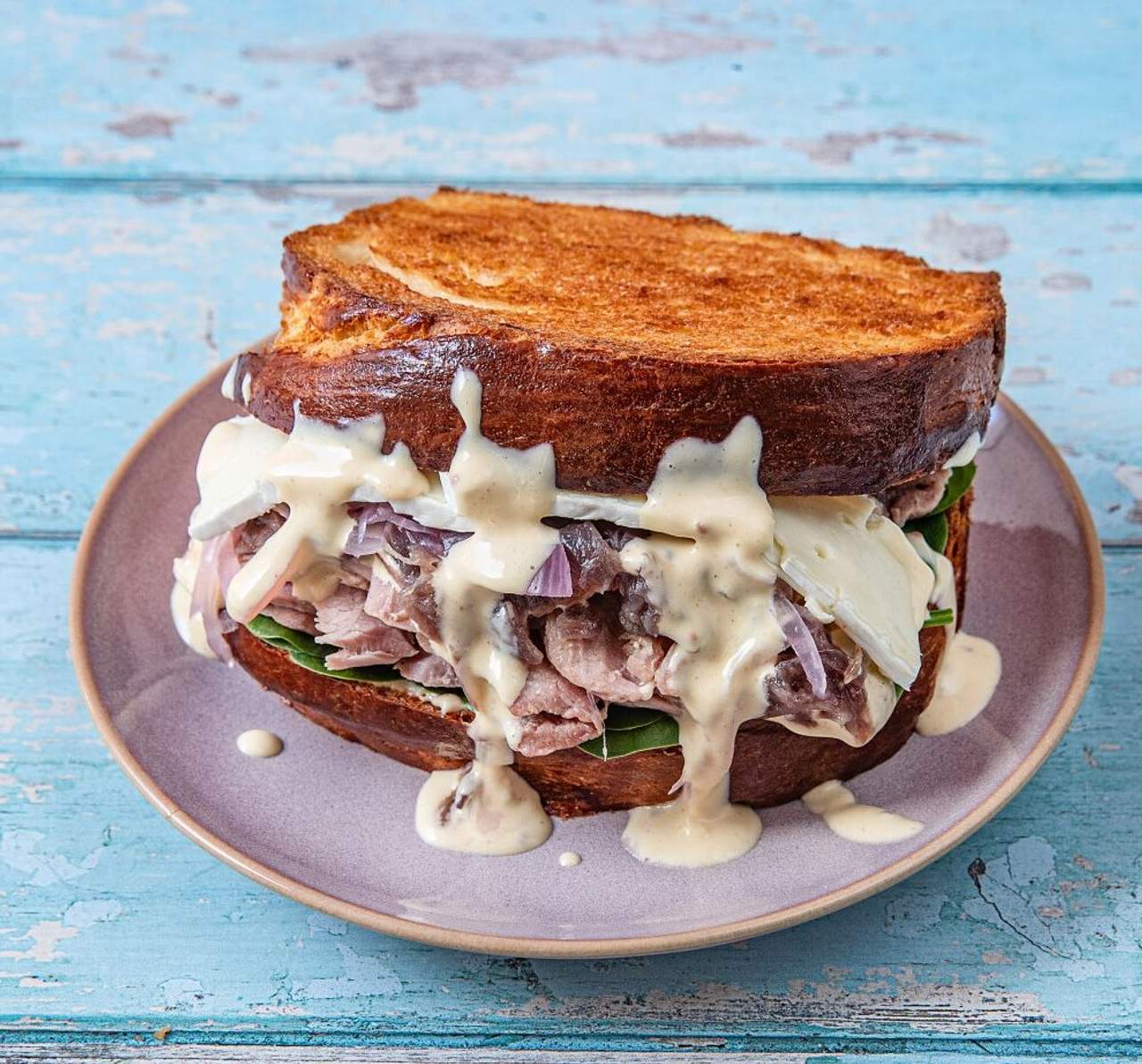 Pavo tierno con queso brie, espinaca y cebolla morada caramelizada, envuelto en una salsa suave de miel y mostaza