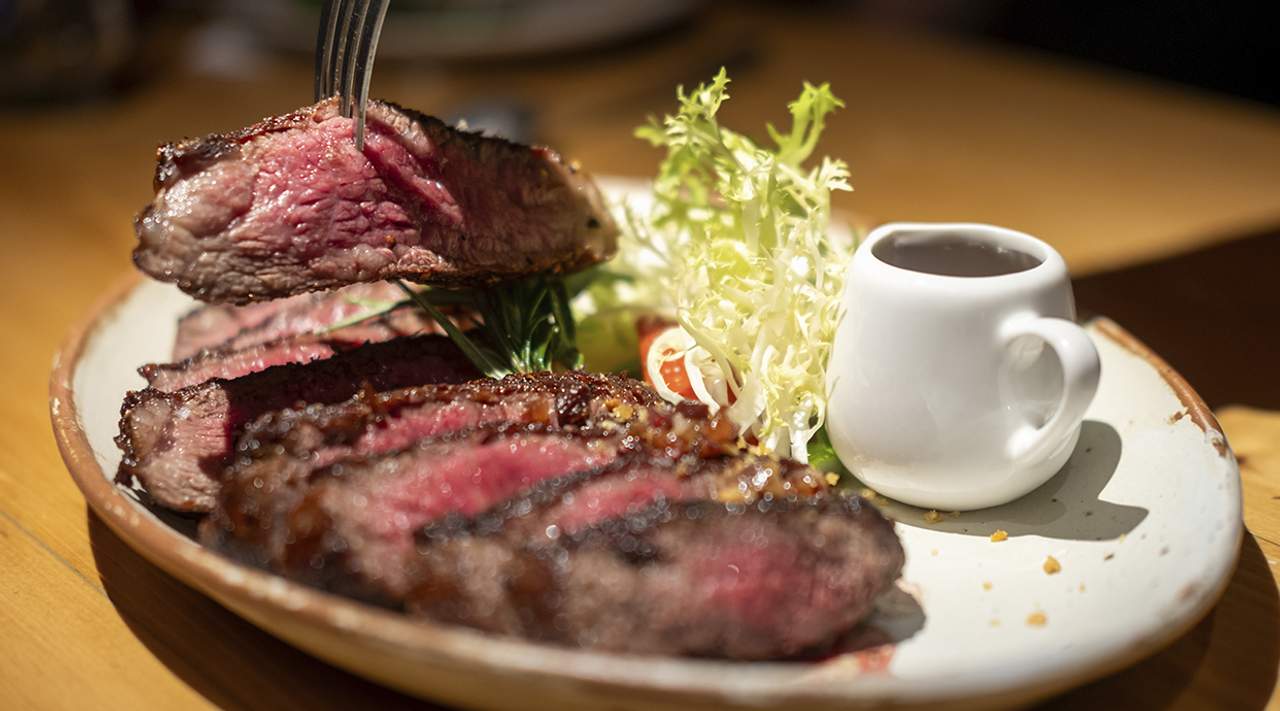 Filete ternera a la plancha, jamón serrano a la plancha, cebolla pochada