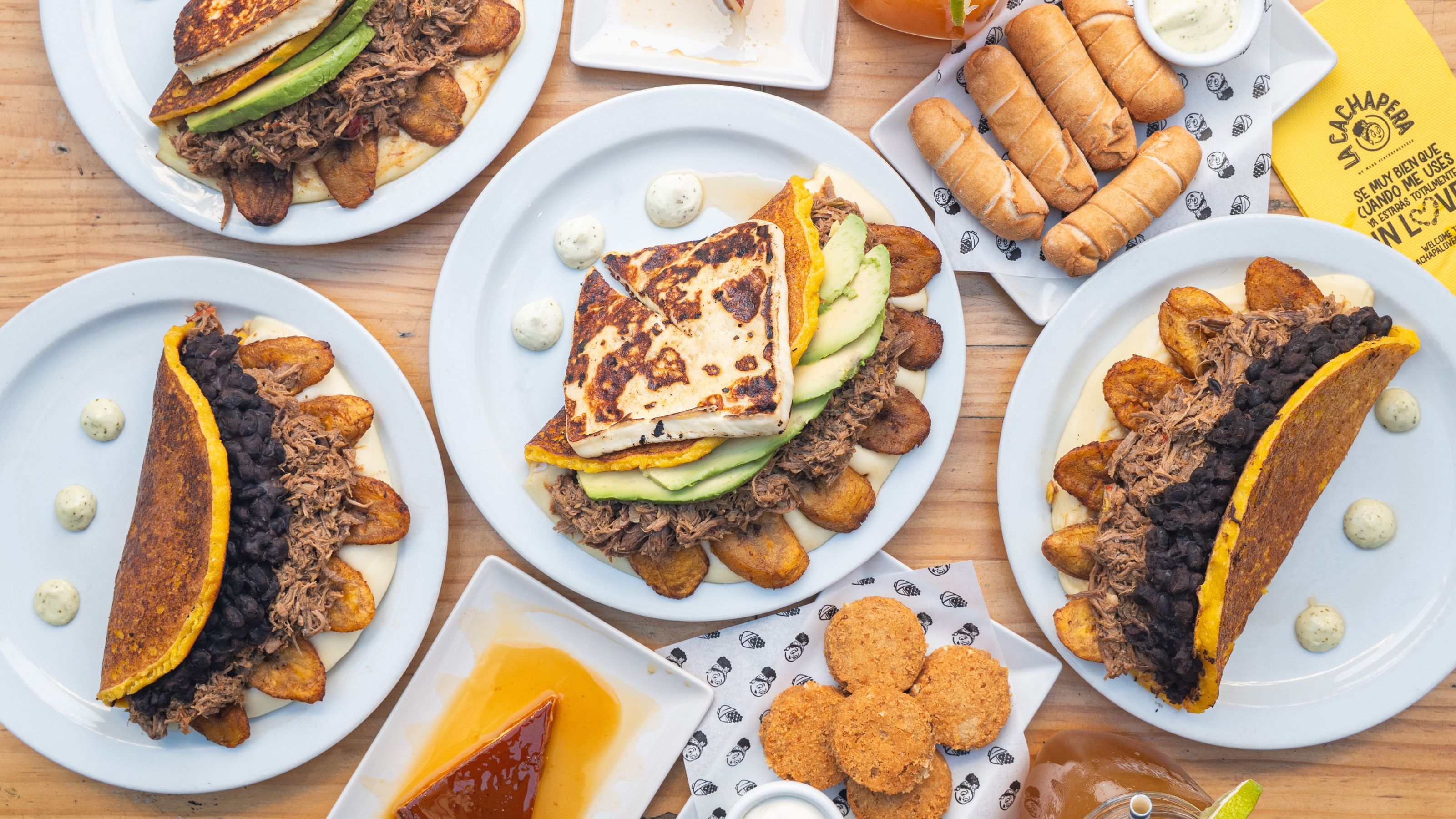 Una arepa excepcional rellena de carne mechada, junquito (cerdo frito), reina pepiada, queso de mano y aguacate fresco. ¡Una combinación divina de sabores venezolanos!