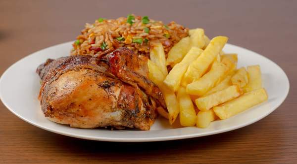 1/4 De pollo a la brasa con patatas fritas artesanales y arroz chaufa