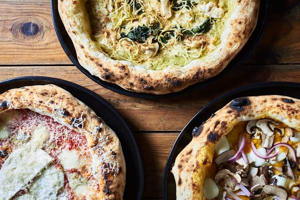 Salsa de tomate, mozzarella vegana, tomate seco, champiñones de Portobello, bocados de pollo vegetal, mango seco, pesto al pistacho casero