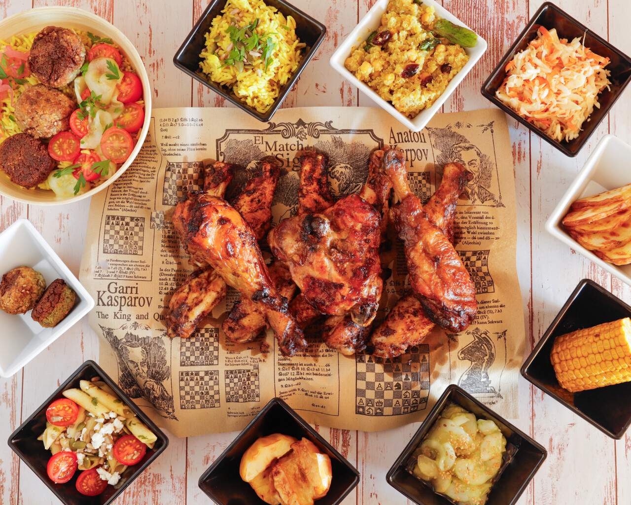 Pollo piri piri hecho a la parrilla, queso y nuestra salsa especial, acompañado de patatas asadas aromatizadas con romero y tomillo