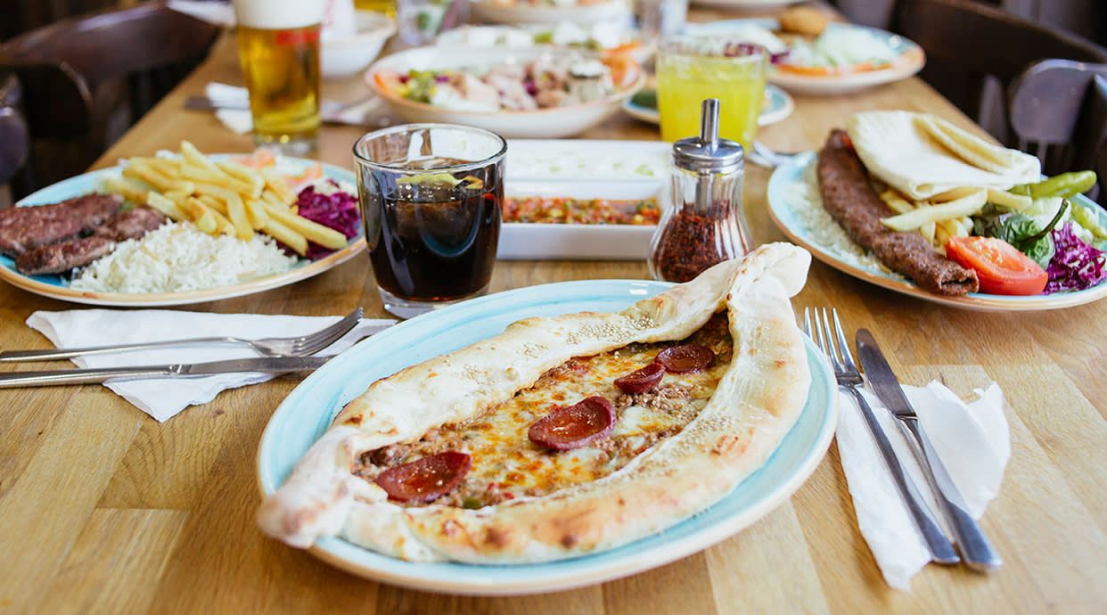 Pan, carne y pollo, falafel, queso, sarma, sigara böregi, arroz, patatas fritas, lechuga, tomate, cebolla, col y salsas