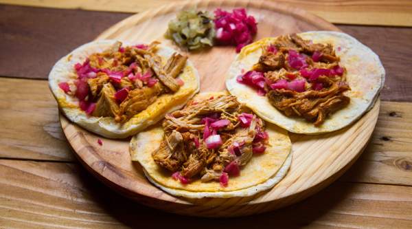 Carne de cerdo marinada 48 horas en axiote y naranja agria acompañada con cebolla morada y encurtida