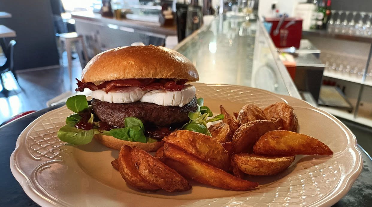 Carne de buey con canónigos, cebolla frita, salsa barbacoa, queso de cabra, bacon en pan brioche