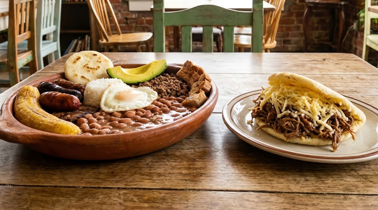 Plato generoso con arroz, frijoles, carne, huevo, chorizo, chicharrón, arepa y aguacate
