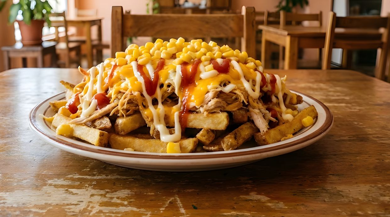 Patatas fritas mucho queso gratinado, pollo desmenuzado y salsa de la casa